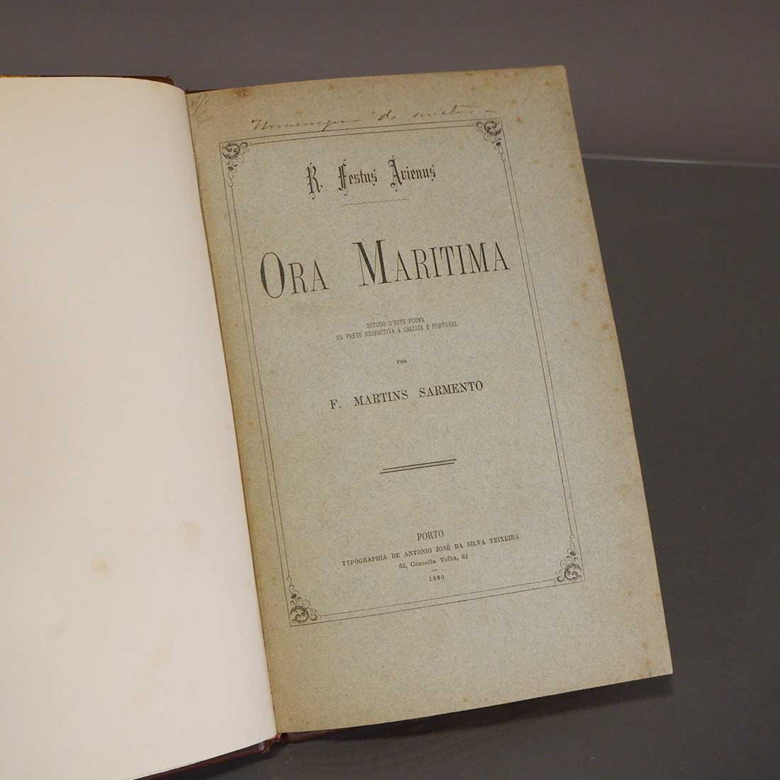 Libro de R. Festus Avienus. Estudo D'Este poema na parte respectiva à Galiza e Portugal por F. Martins Sarmento. Porto 1880. Meia encadernação em pele com ferros a ouro. Sinais de uso e pequenos defeitos.
