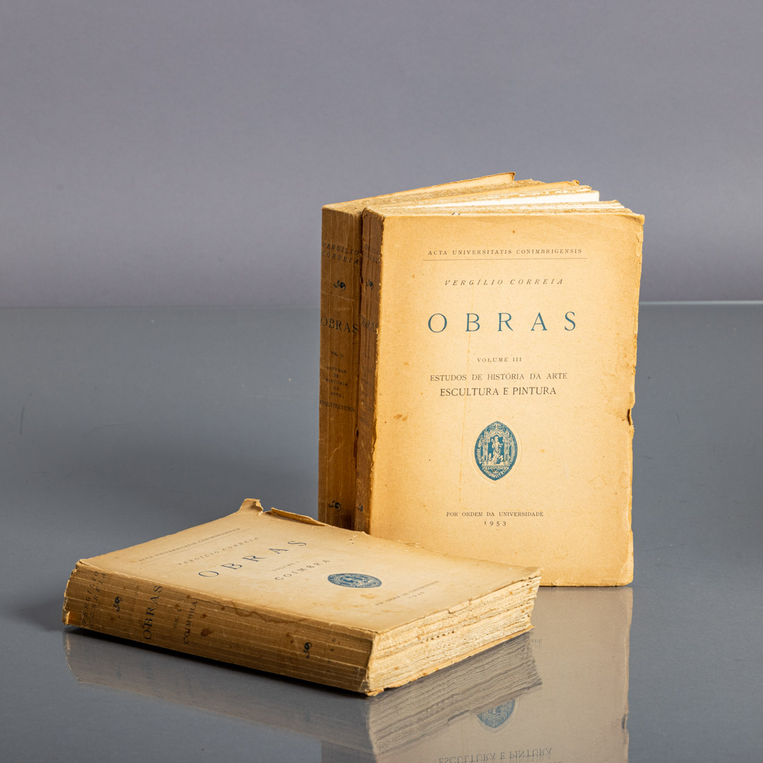 Volume I - Coimbra, volume II - Estudo de História da Arte Arquitectura e volume III - Estudo de história da arte escultura e pintura. Por ordem da Universidade, 1946,1949 e 1953. Em brochura. Pequenas falhas e defeitos.