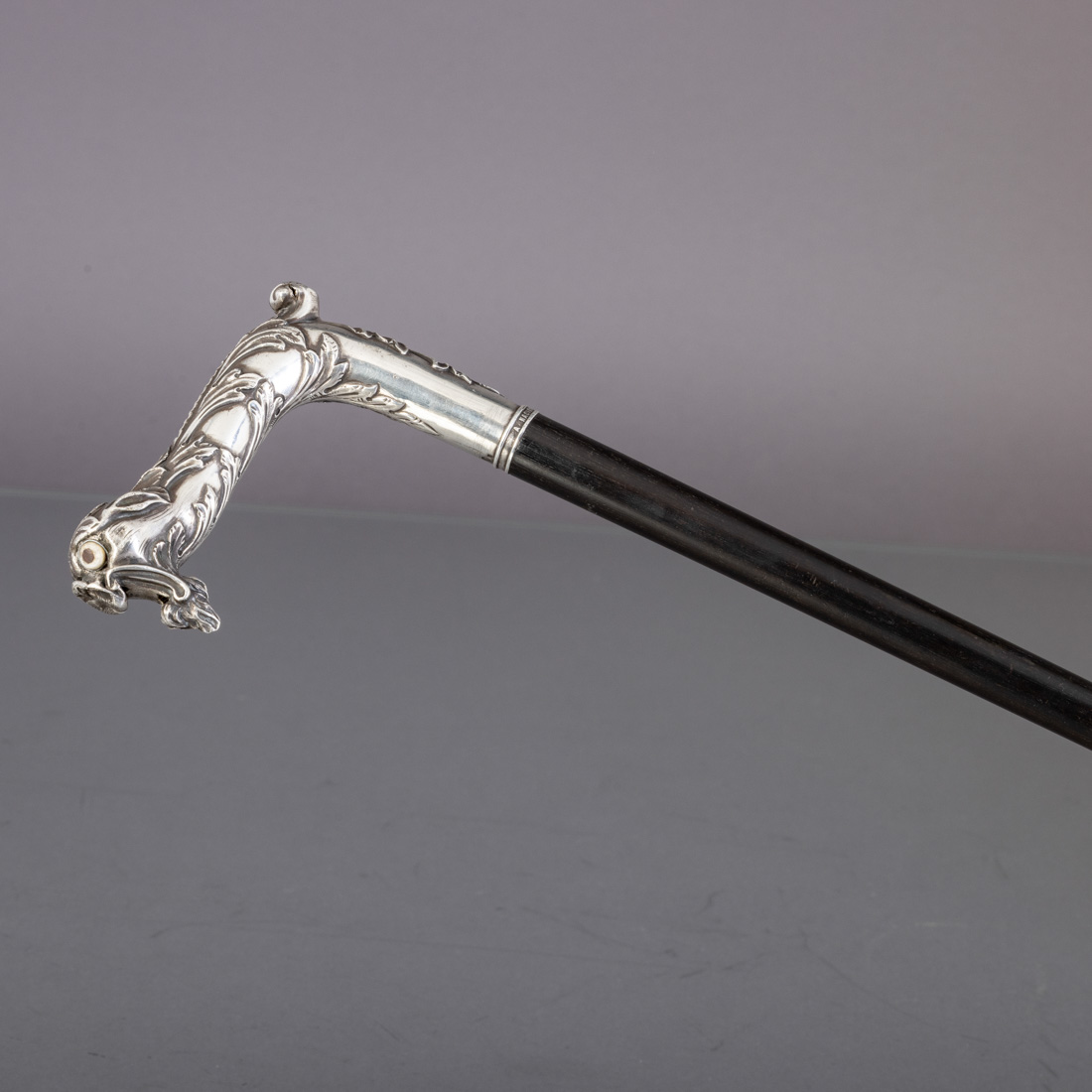 Em madeira exótica, castão em prata portuguesa contraste javali (1887-1937) de 833, decoração relevada e inscrição "A Nacional M. Registada". Pequenas amolgadelas e leve falha e restauro num olho.