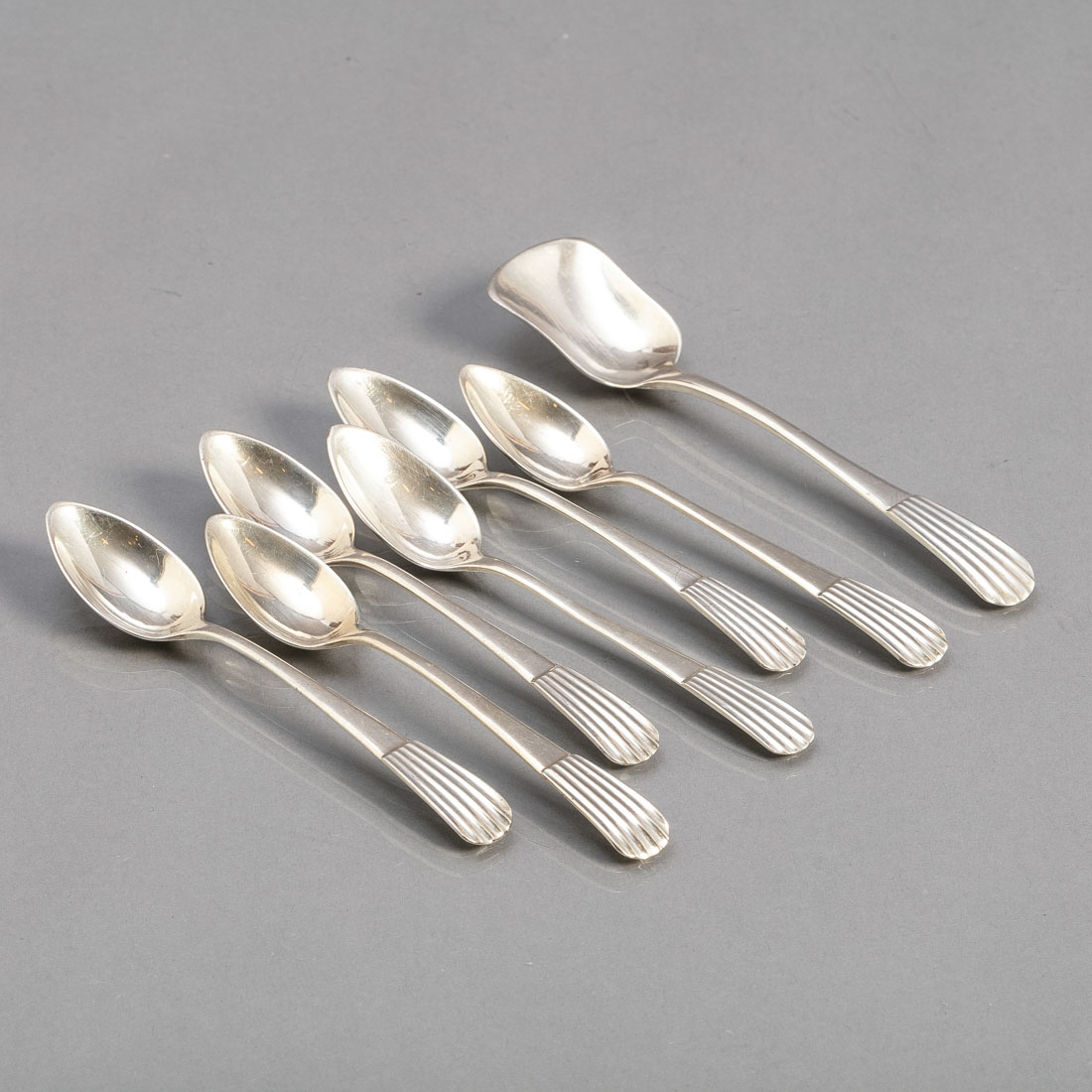 130. CONJUNTO DE SEIS COLHERES DE CHÁ E CONCHA DE AÇÚCAR