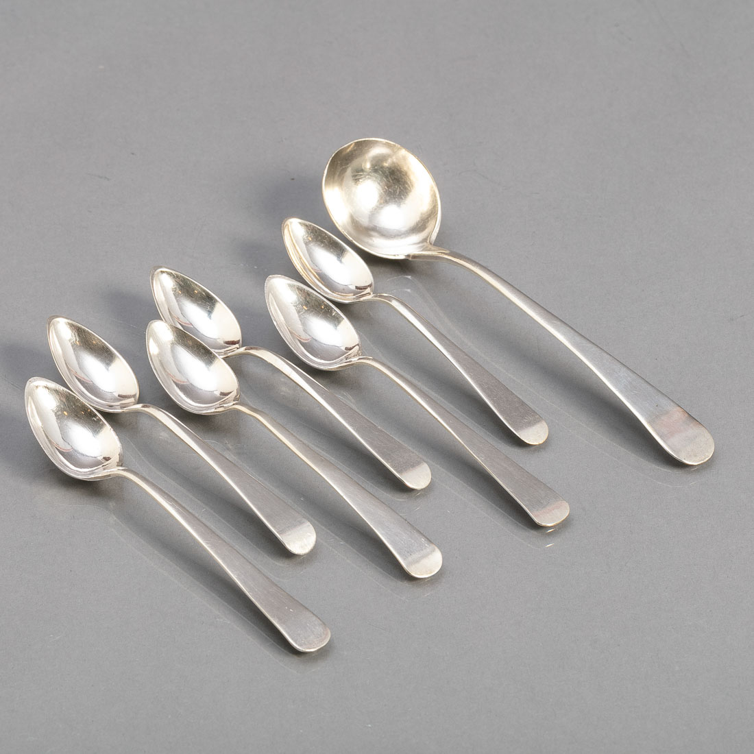 131. CONJUNTO DE SEIS COLHERES DE CAFÉ E CONCHA DE AÇÚCAR