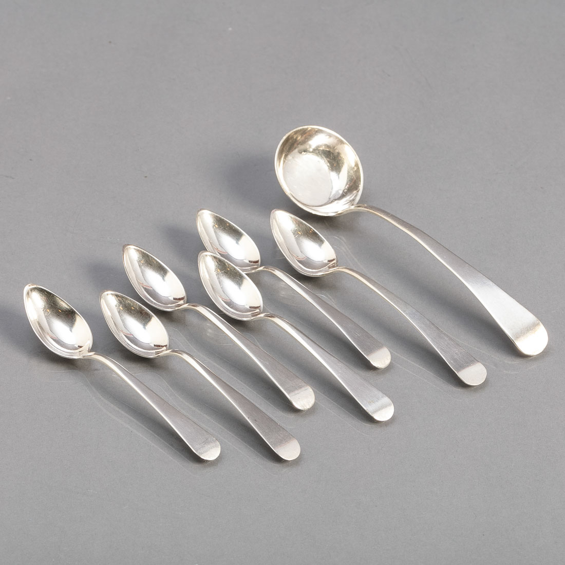 132. CONJUNTO DE SEIS COLHERES DE CAFÉ E CONCHA DE AÇÚCAR