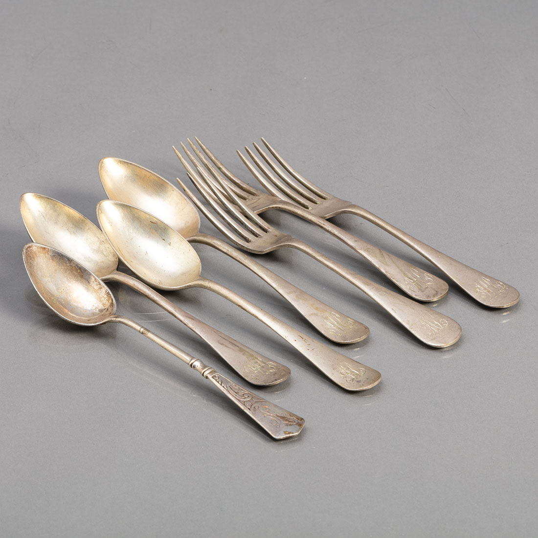 Em prata portuguesa contraste javali (1887-1937) de 833, decoração lisa com monograma, uma colher decorada com gravados e monograma, sem marca visível, ao abrigo do Decreto-Lei n.º 120/2017. sinais de uso.