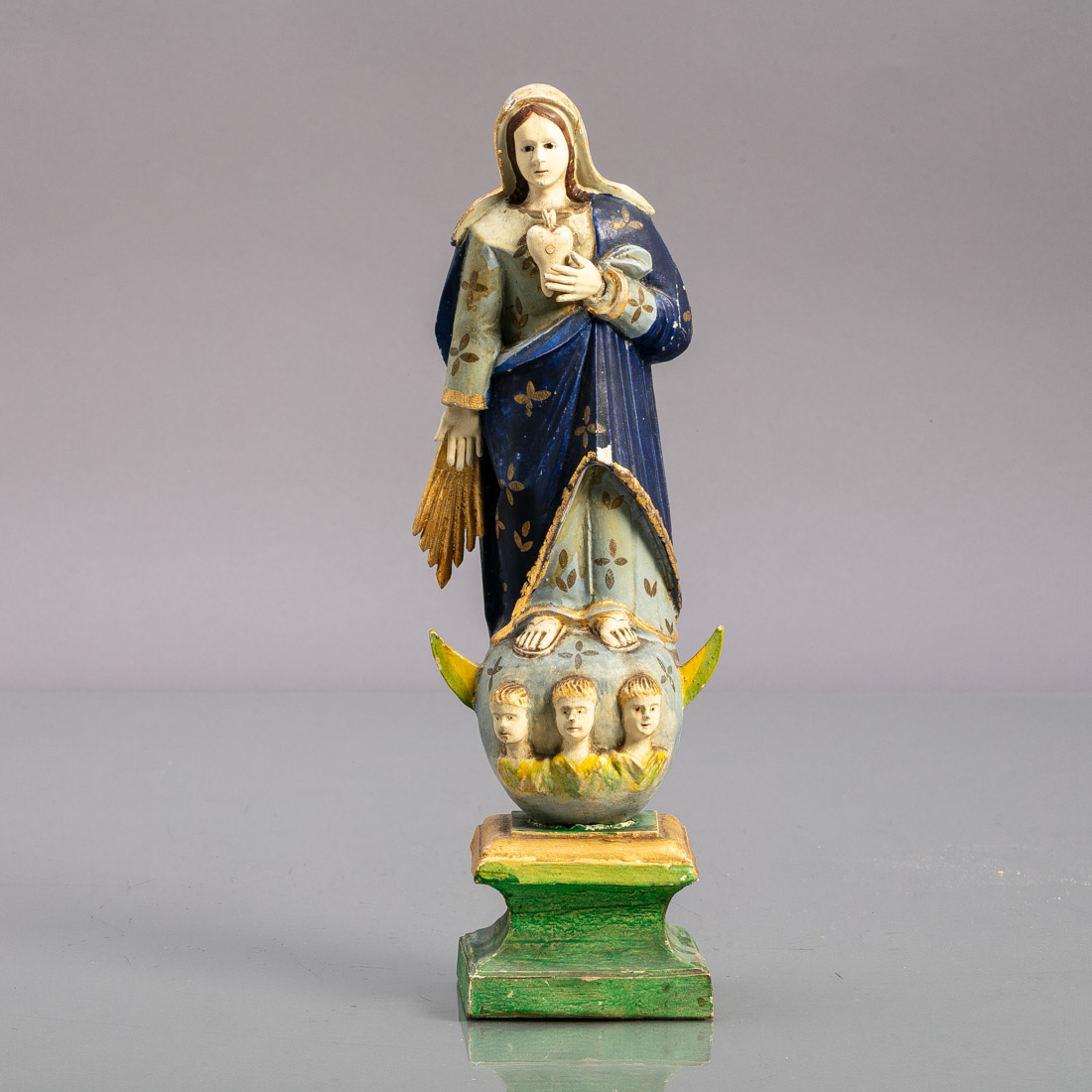 Escultura em madeira policromada e dourada, olhos de vidro Séc. XIX/XX. Pequenos defeitos, repintes.