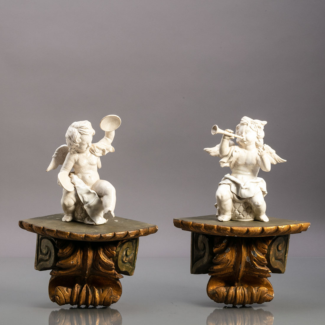 Esculturas em cerâmica vidrada, decoração monocroma a branco, craquelé. Italianas. Restauros, falhas e pequenos defeitos. Mísulas em madeira entalhada pintada e dourada. Falhas e pequenos defeitos.