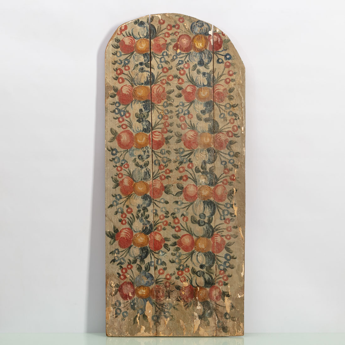 Em madeira pintada, decoração policromada com frutos. Séc. XVIII. Falhas e pequenos defeitos, vestígios de xilófagos.