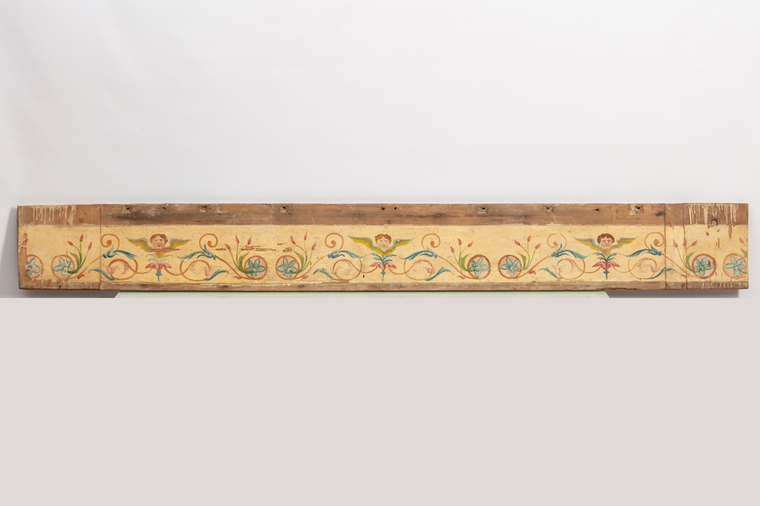 Em madeira pintada, decoração policromada com cabeças de querubins e enrolamentos. Séc. XVIII. Pequenas falhas e vestígios de xilófagos.
