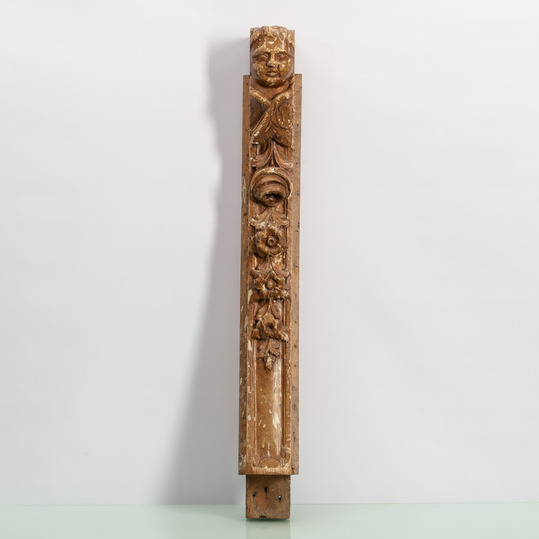 Em madeira entalhada e dourada com cabeça de querubim e flores. Séc. XVIII. Falhas e vestígios de xilófagos.