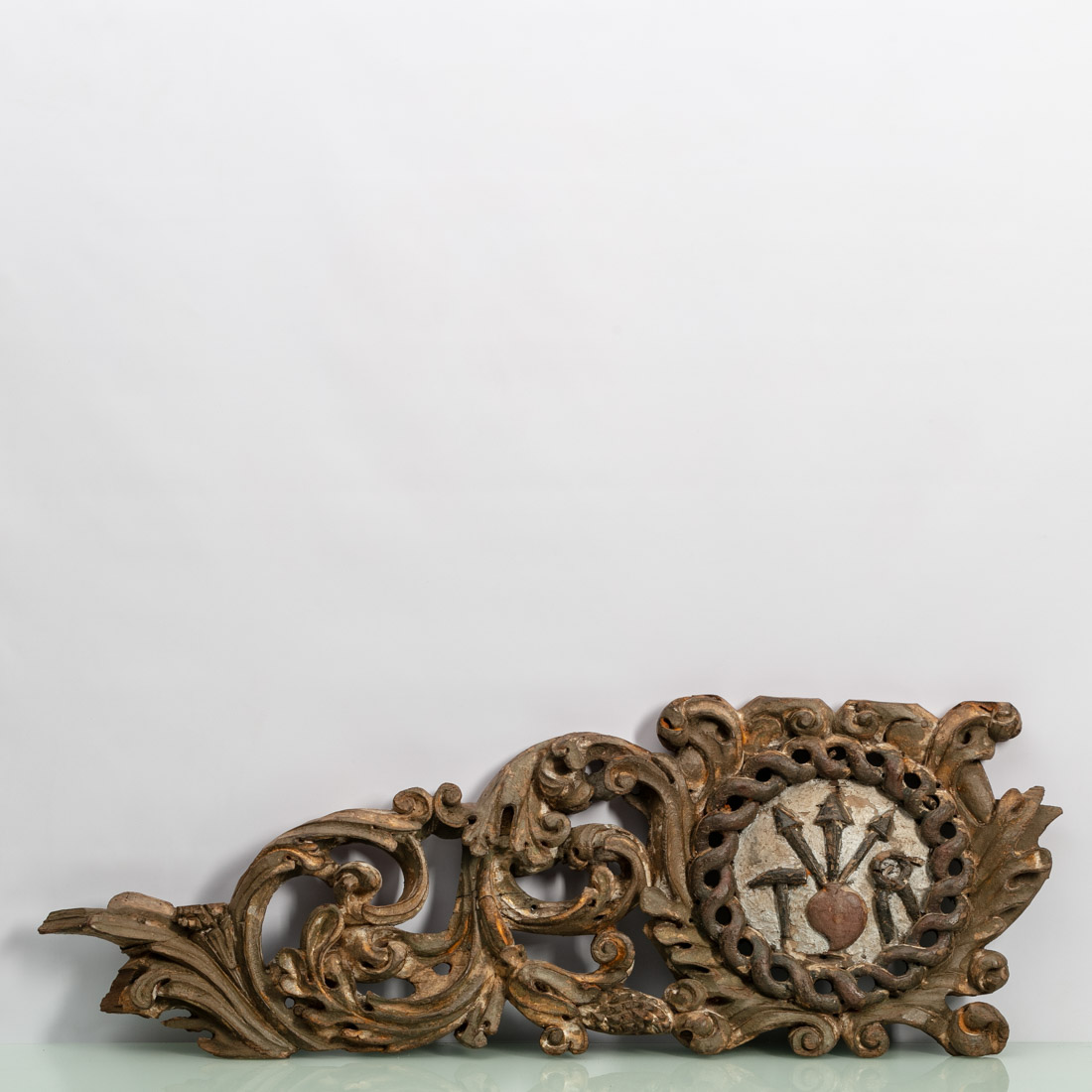 Em madeira entalhada e vazada, decoração policromada e restos de dourado "Símbolos da paixão de Cristo". Séc. XVIII. Falhas, defeitos e vestígios de xilófagos.