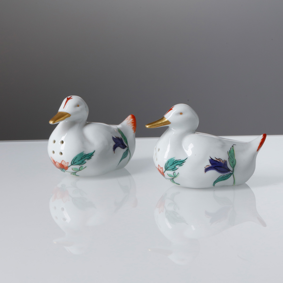 Em porcelana moldada (1980-1992), decoração policromada e dourada.