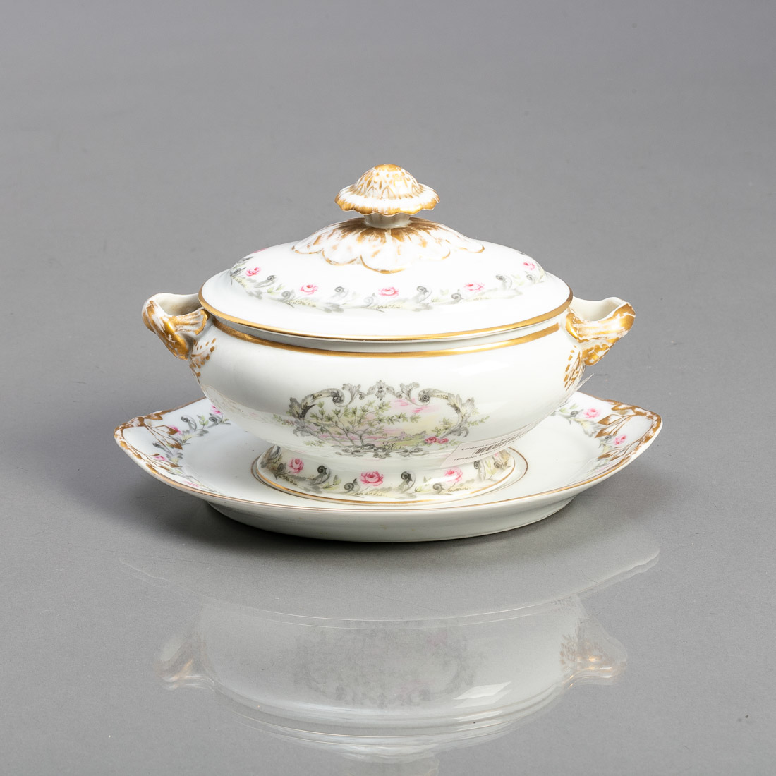 Em porcelana moldada e relevada (1947-1968), decoração policromada e dourados com motivos florais. Sinais de uso.