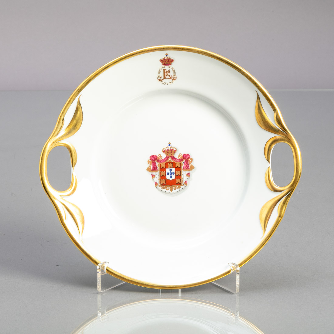 Em porcelana moldada (2004), decoração policromada e dourada "Armas reais portuguesas". Cópia da Colecção do Palácio Nacional da Ajuda.