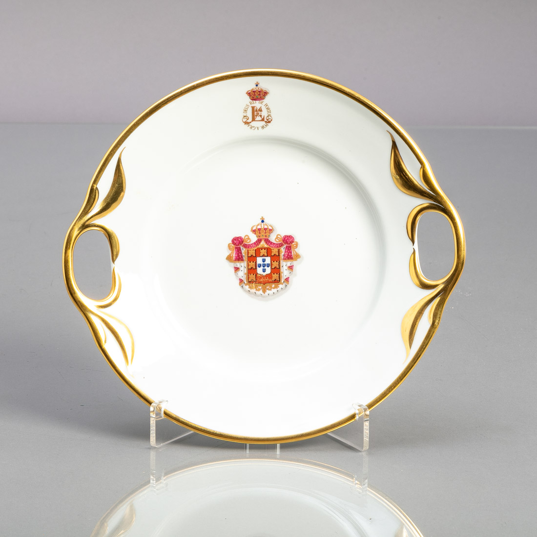 Em porcelana moldada (1992-1997), decoração policromada e dourada "Armas reais portuguesas". Cópia da Colecção do Palácio Nacional da Ajuda.