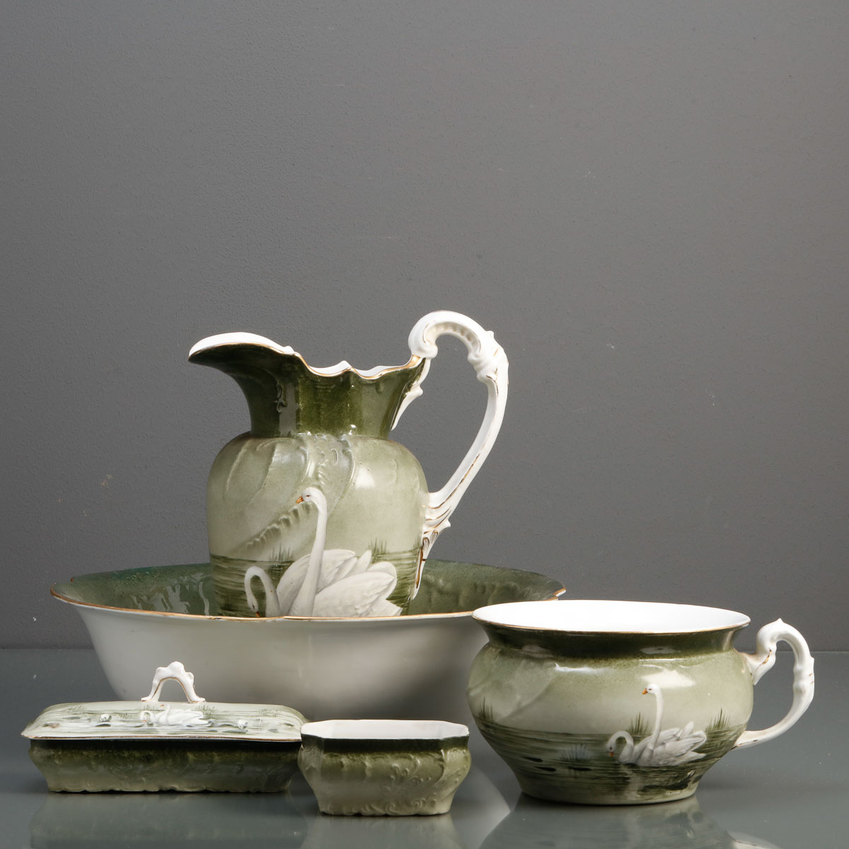 Em porcelana moldada e relevada (1924), decoração em tons de verde com cisnes em lago e ouro. Composto por jarro, bacia, penico e duas caixas. Bacia e caixa com restauros, a outra caixa sem tampa.