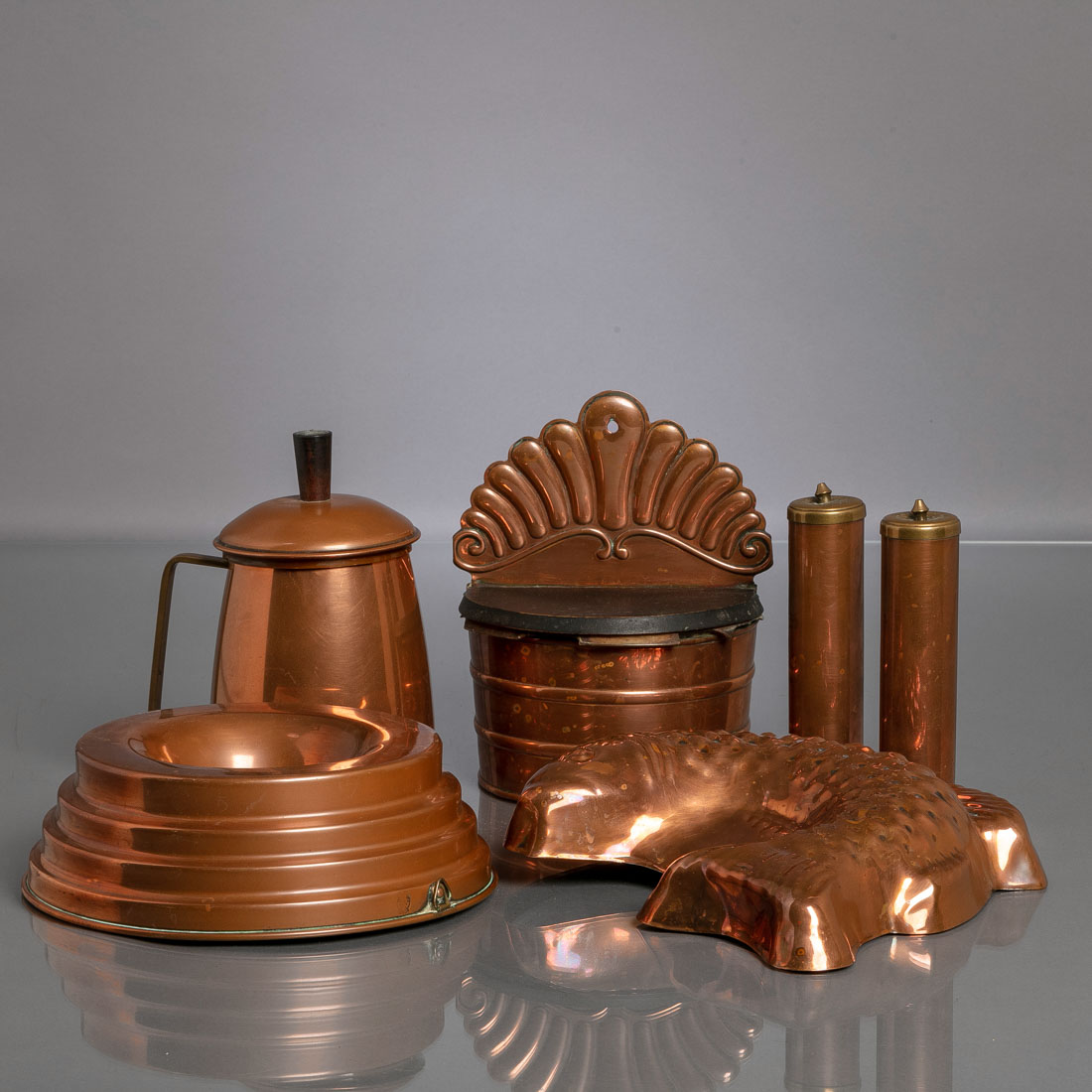 Em cobre e latão, marcado B&M Douro (Portugal). Séc. XX. Composto por duas formas para bolo, conjunto de saleiro e pimenteiro, jarro e saleiro. Pequenas amolgadelas e recipiente do saleiro com falhas.