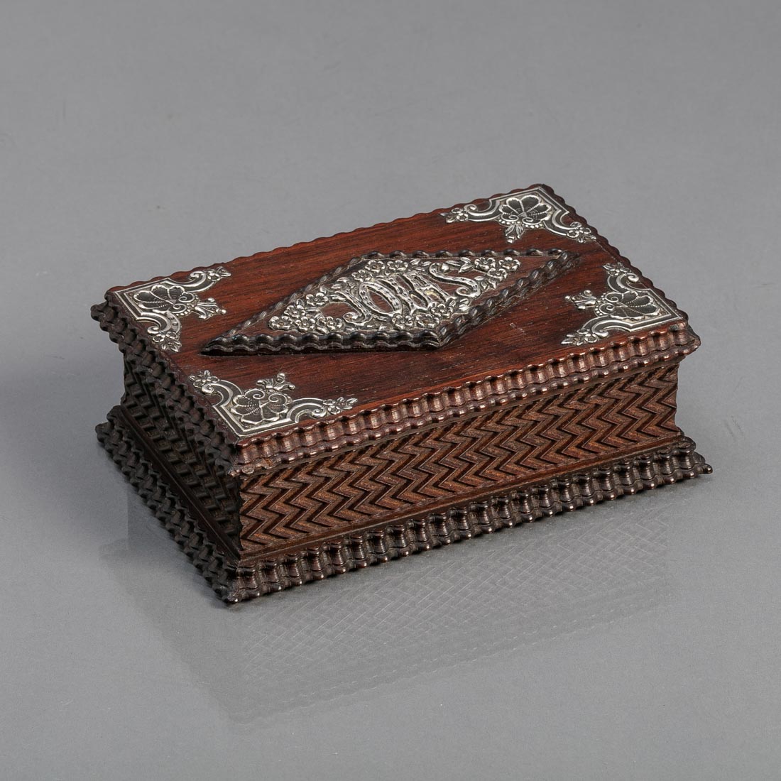 Em pau santo com tremidos, aplicações em prata portuguesa contraste javali (1887-1937), decoração relevada "flores". Ínfimas falhas.
