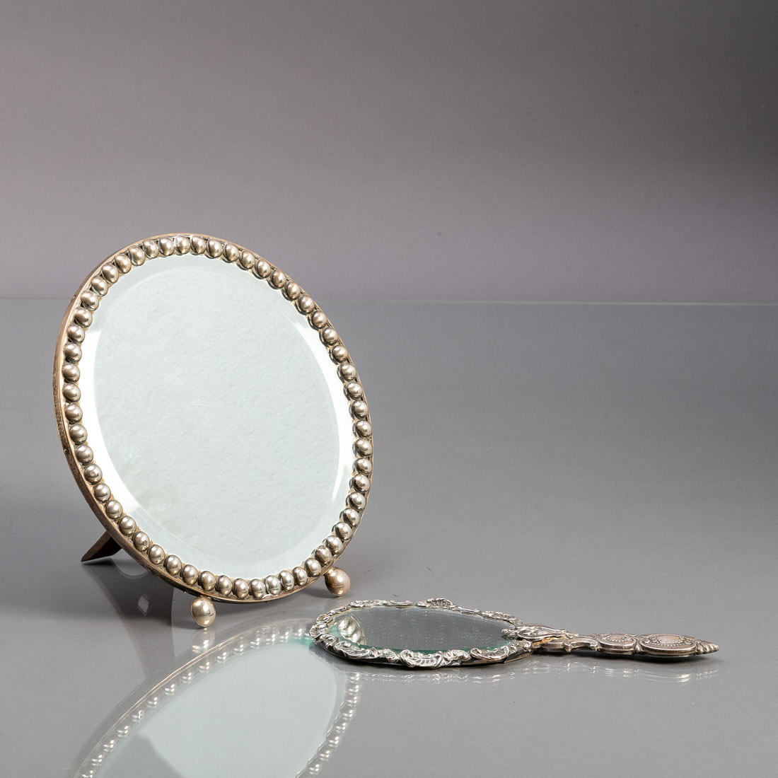 Em prata portuguesa contraste águia (1938-1984) de 833, relevada, um de mesa redondo decorado com perlados, outro de mão decorado com concheados. Pequenas amolgadelas e pequenos defeitos.