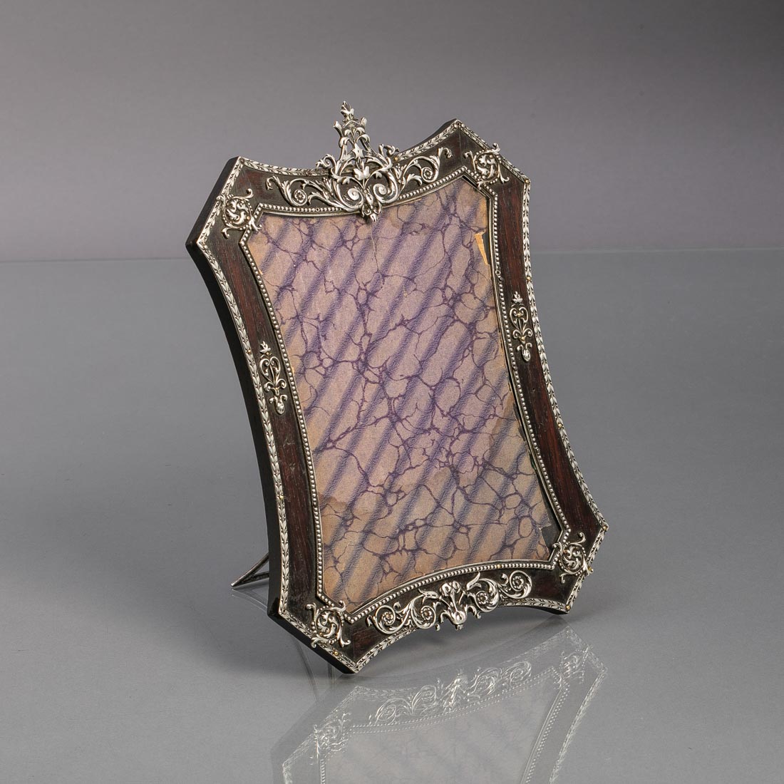 Moldura em pau santo, aplicações em prata portuguesa contraste javali (1887-1937), decoração relevada e vazada com elementos vegetalistas e perlados. Ínfimas falhas.