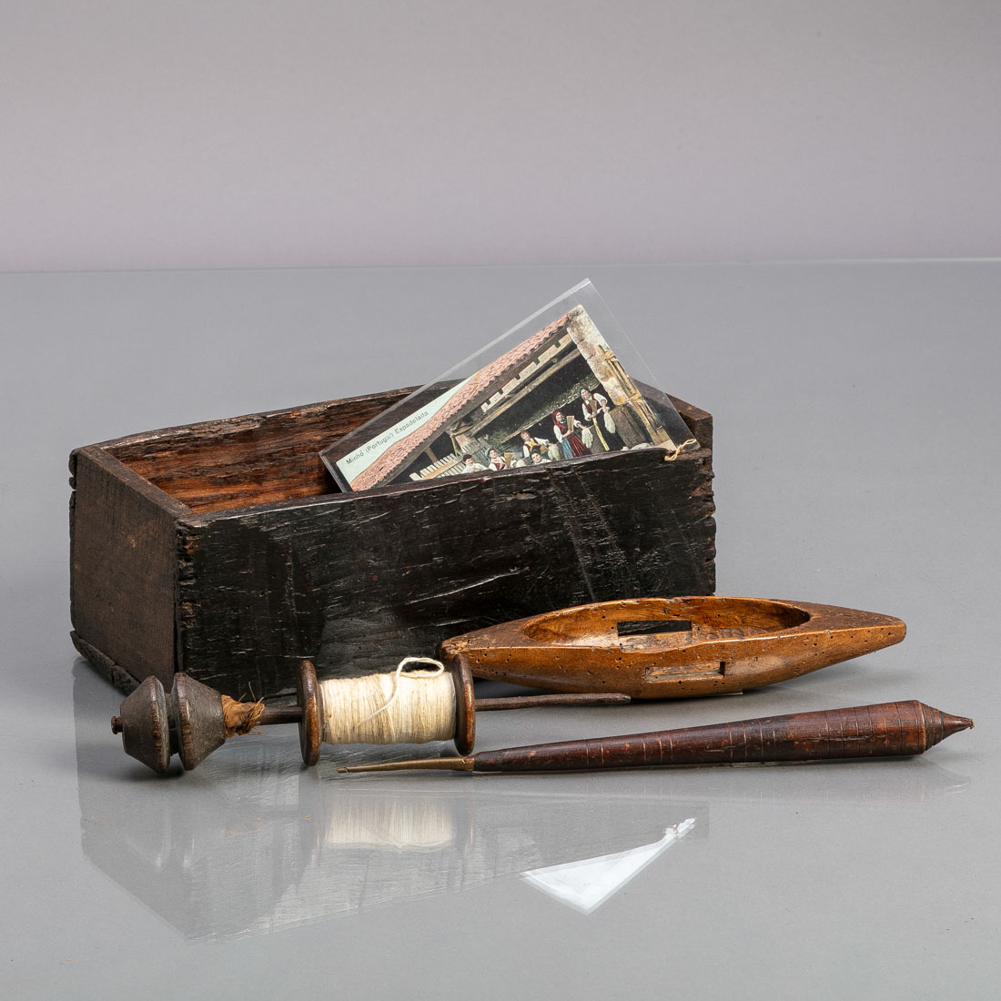 Em madeira e metal, composto por caixa, lançadeira, fuso e canela. Portugal Séc. XX. Pequenos defeitos e falhas de xilófagos.