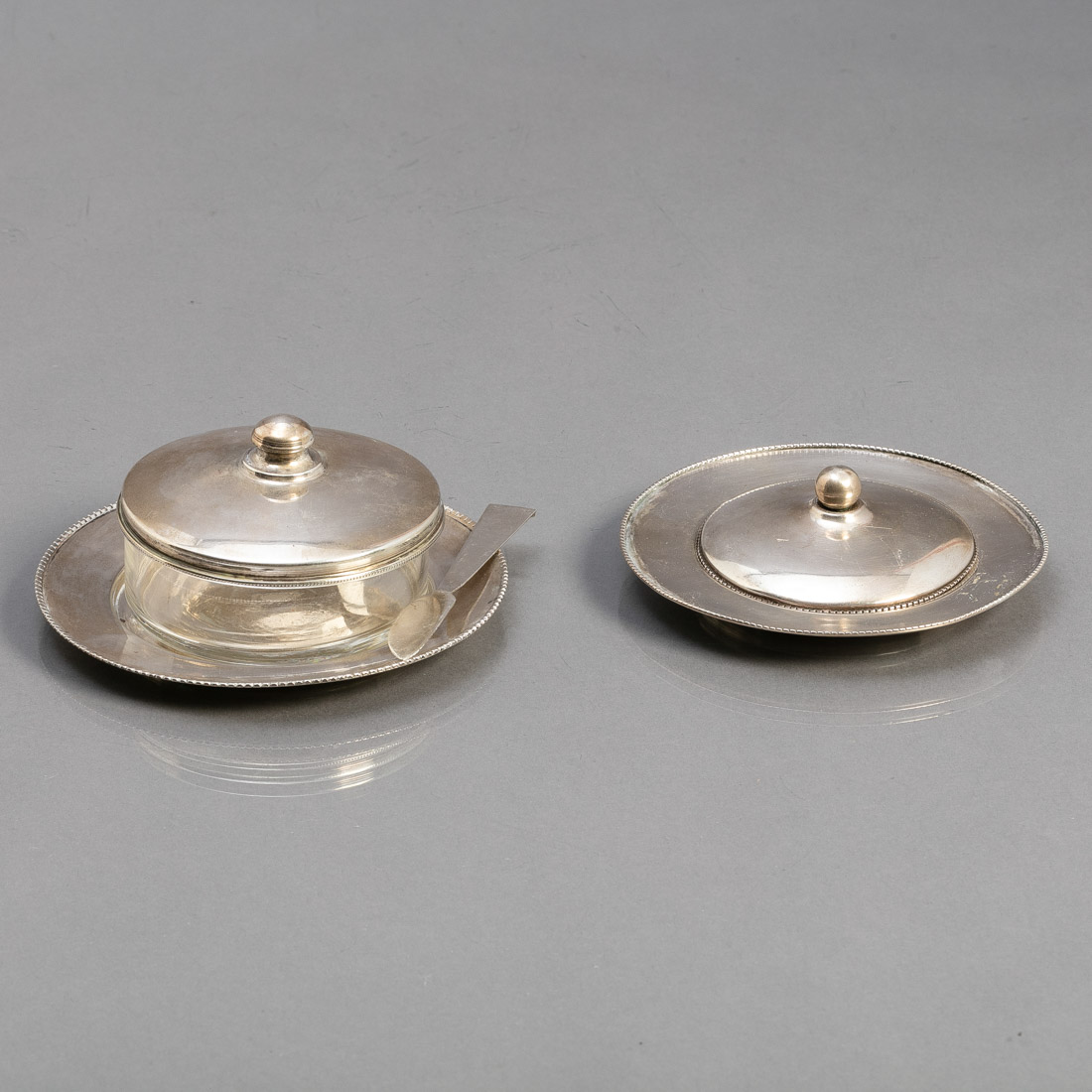 Em prata portuguesa contraste águia (1938-1984) de 833, recipientes em vidro. Uma com colher.