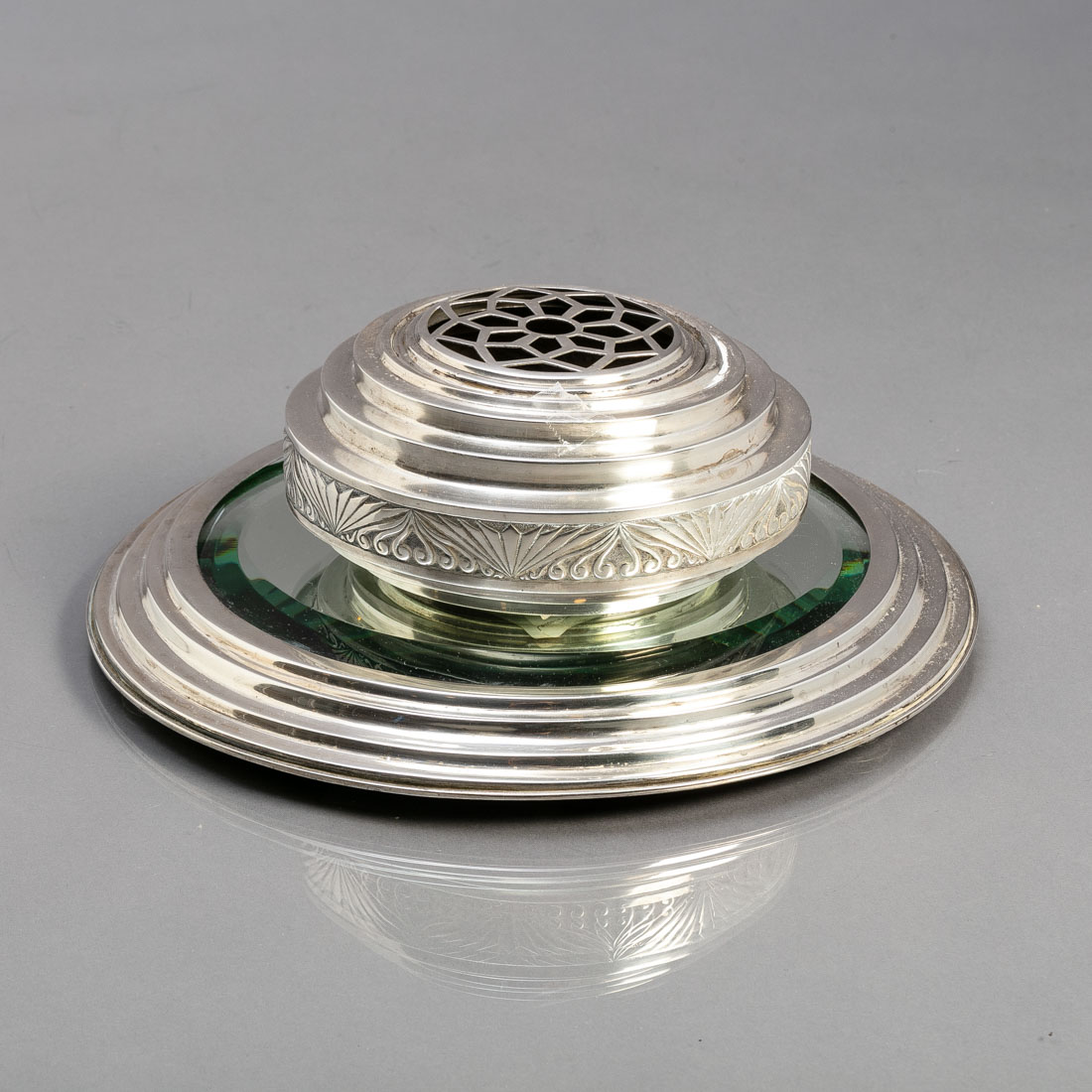 Art Deco, em prata portuguesa contraste javali (1887-1937) de 833, decoração relevada, grelha vazada. Plateau com pequeno defeito e falta de um pé.