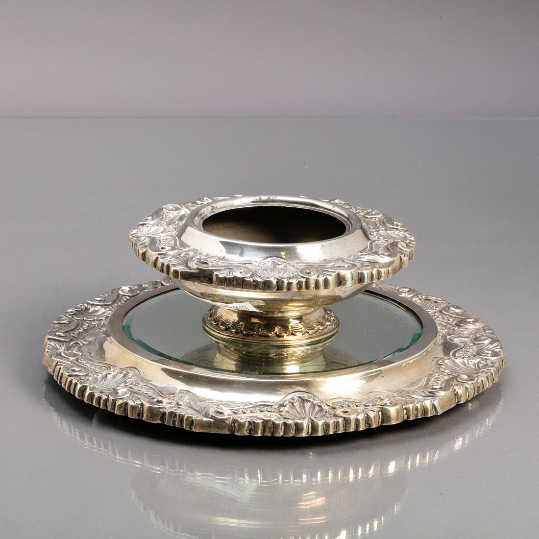 Em prata Portuguesa contraste águia (1938-1984) de 833, decoração relevada com elementos vegetalistas, enrolamentos e concheados. Sinais de uso e falta de grelha.