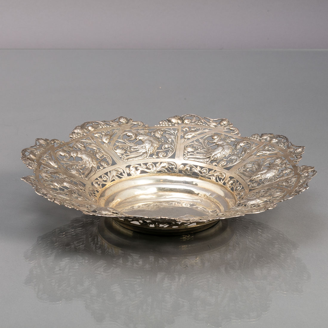Em prata espanhola marcada R. Fernandez, Vigo, decoração relevada e vazada com pássaros e elementos vegetalistas. Amolgadelas.