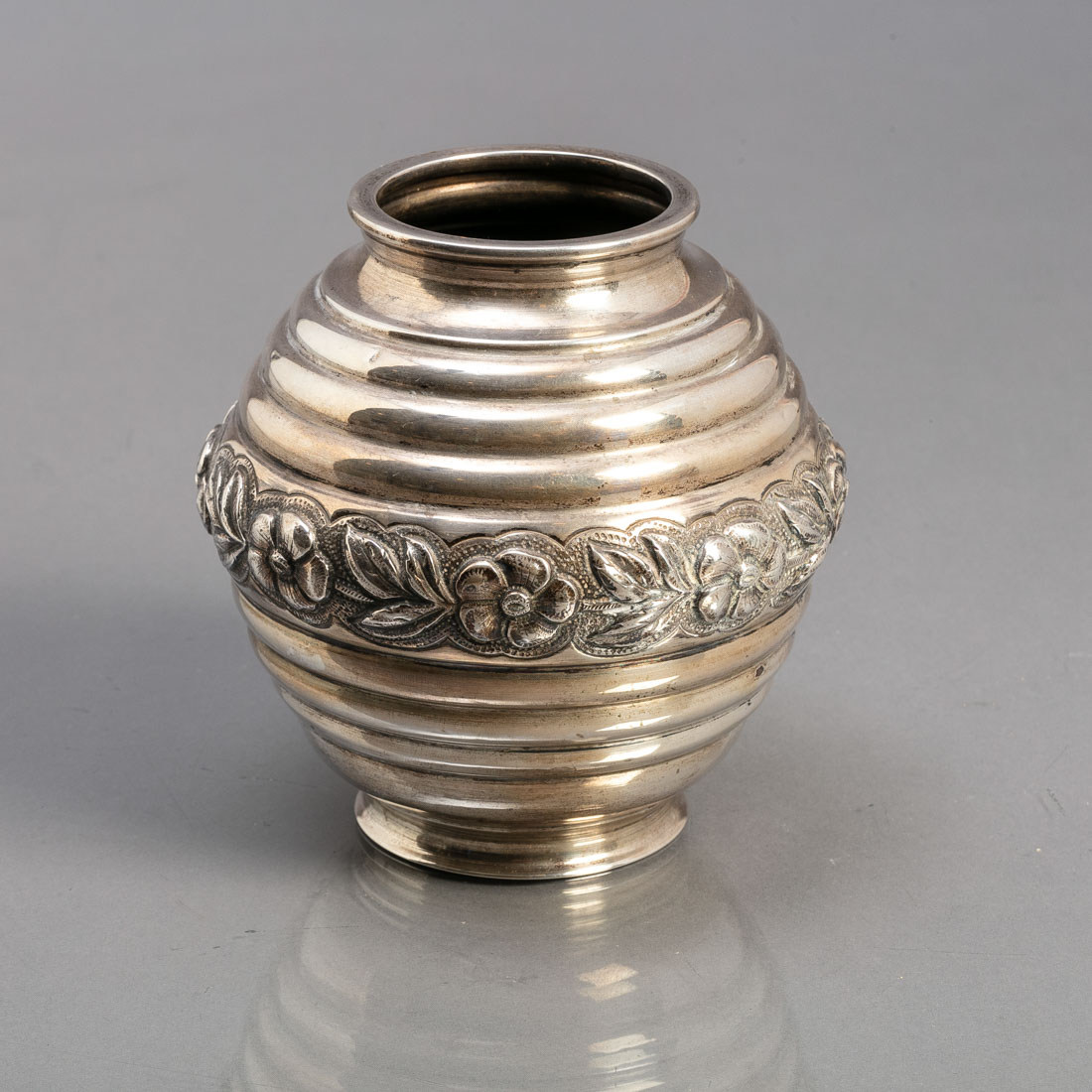 Em prata portuguesa contraste águia (1938-1984) de 833, decoração relevada e canelada com friso de flores. Leves amolgadelas.