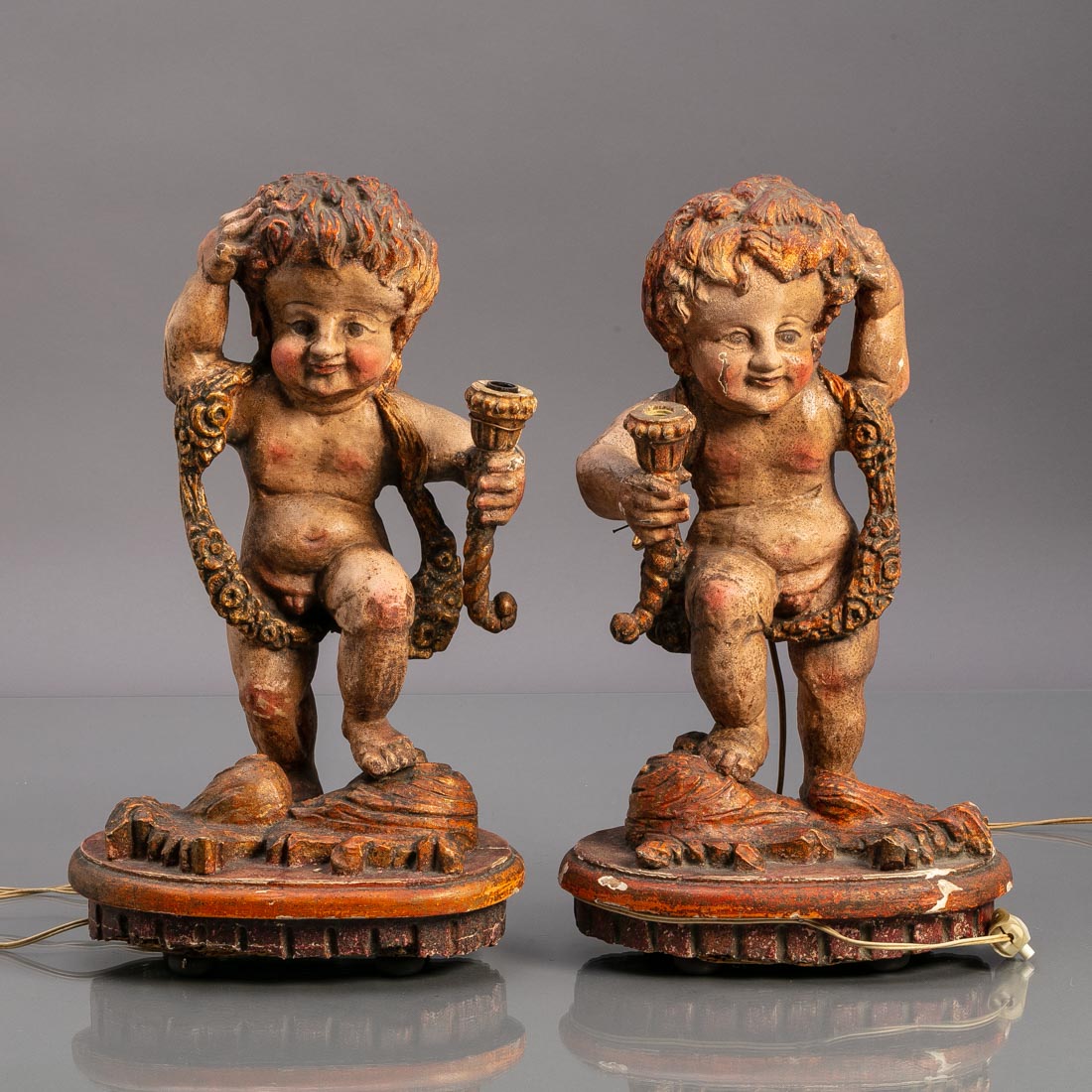 Esculturas em madeira entalhada, policromada e dourada, electrificados. Pequenas falhas e defeitos de xilófagos,