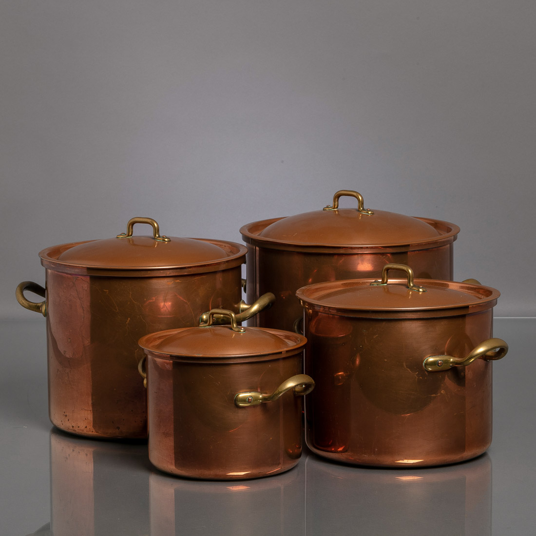 Em cobre e pegas em latão, interiores estanhados. Séc. XX. Sinais de uso.