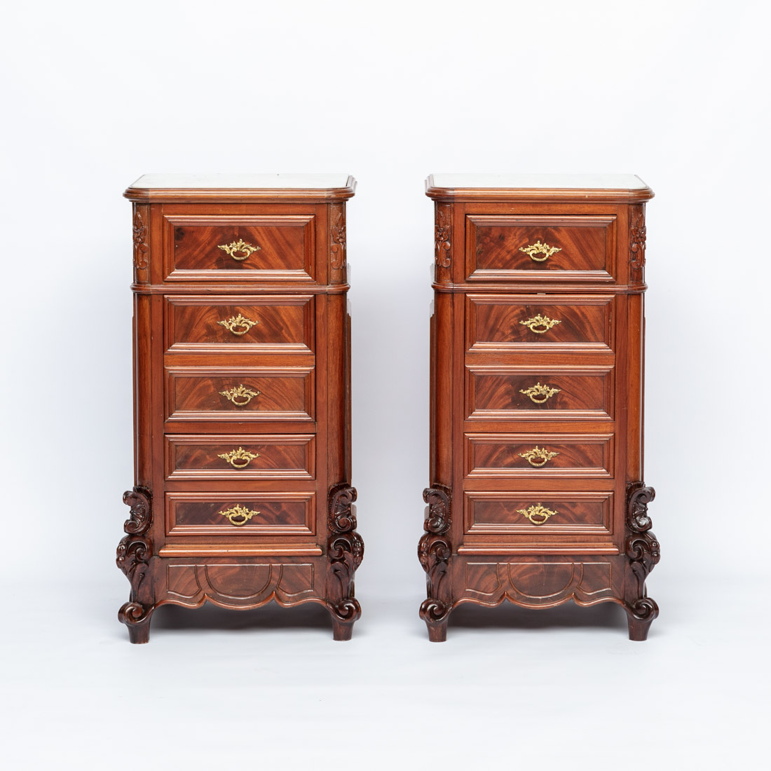 Em nogueira e folheada a nogueira com entalhamentos, de três gavetas simulando cinco, porta de rebater, tampo de mármore. Sinais de uso.