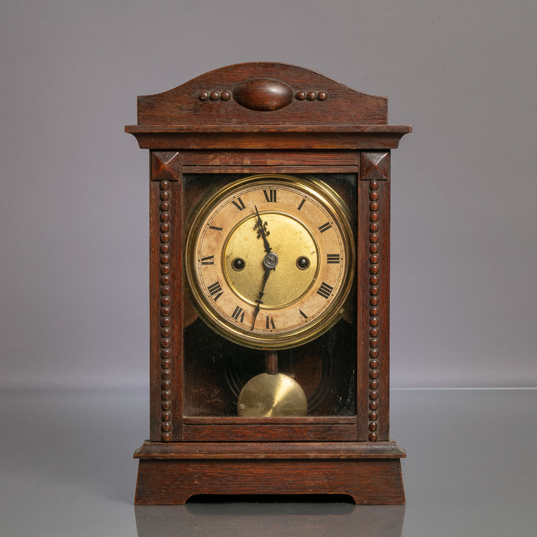 Caixa em madeira com leves entalhamentos, mostrador com numeração romana. Não funciona.