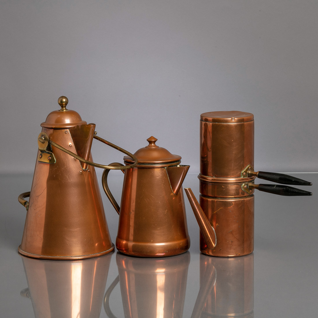 Em cobre e pegas em latão. Duas marcadas B&M Douro (Portugal). Séc. XX. Sinais de uso e uma com pequenas amolgadelas.