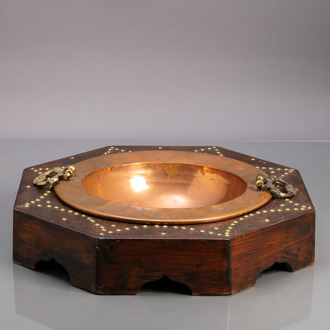 Em cobre com asas em latão "Rocha". Base em madeira ornada com pregaria. Amolgadelas, defeitos e vestígios de xilófagos.