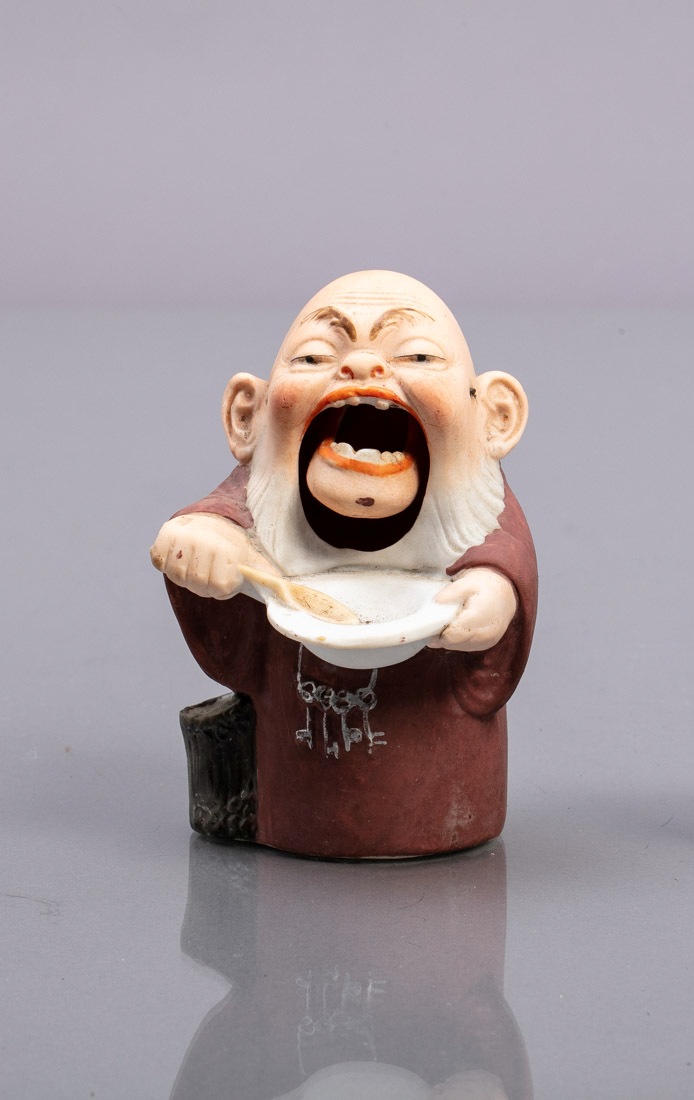 Escultura em biscuit decoração policroma, boca com movimento. Sinais de uso.