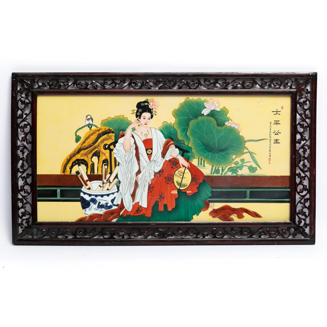 Em porcelana da China, decoração policromada representando paisagem com figura feminina, com caligrafia, assinada. Moldura em madeira exótica entalhada e vazada. Sinais de uso.