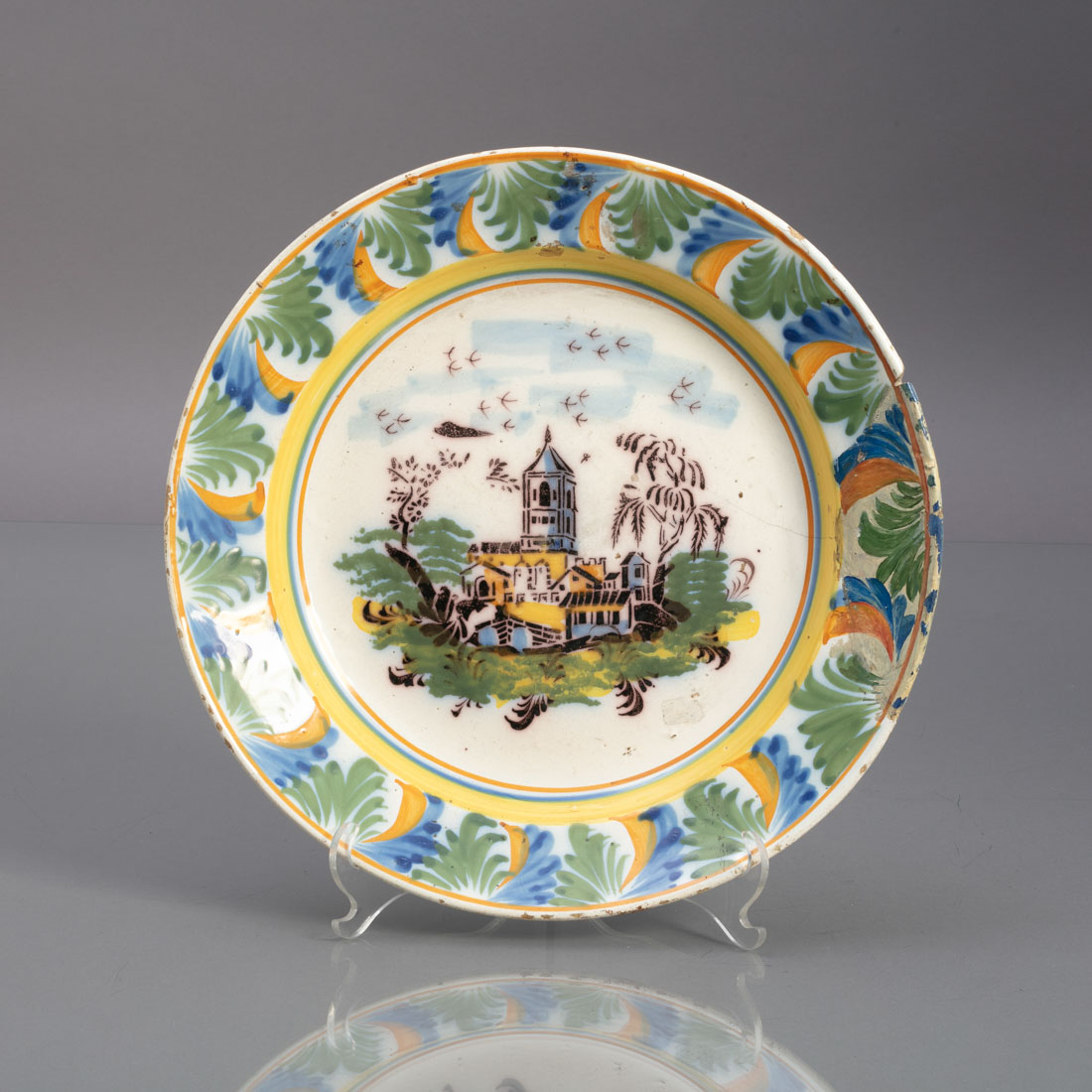 Em faiança portuguesa, decoração policromada "paisagem com palacete", na aba elementos vegetalistas, Séc. XIX. Esbeiçadelas, cabelo, aba com restauro (aprox.15 cm.)