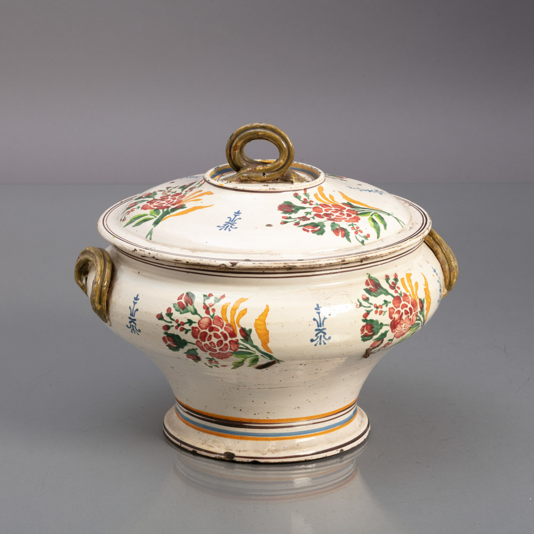 Em faiança portuguesa, decoração policromada "flores. Séc. XIX/XX. Base com esbeiçadelas, cabelo gateado e pequena falha numa asa, tampa com falha e pomo colados.