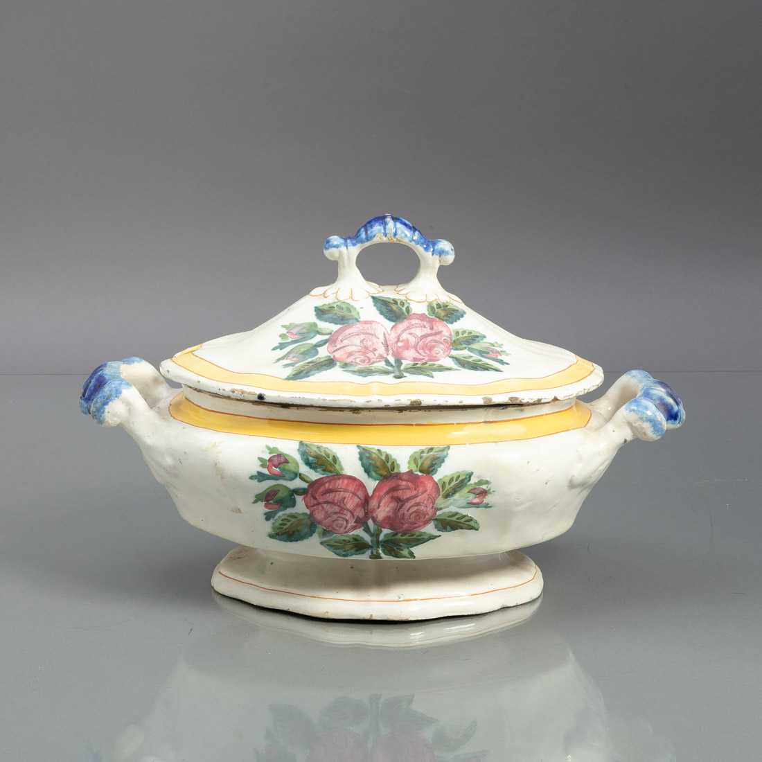 Em faiança portuguesa, decoração policromada com motivos florais. Esbeiçadelas e restauro na base.
