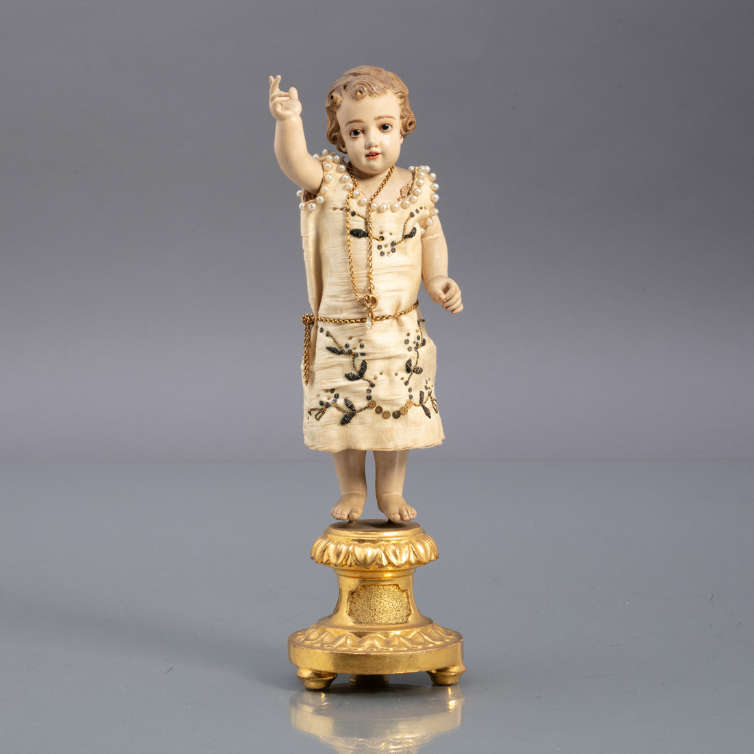 Escultura em madeira policromada, olhos de vidro, vestes em seda bordada (peq.defeitos) Peanha em madeira entalhada e dourada. Séc. XX. Volta e cinto em ouro de 19,2Kt., contraste tigre (1887-1937). Peso Aprox: 6 g.