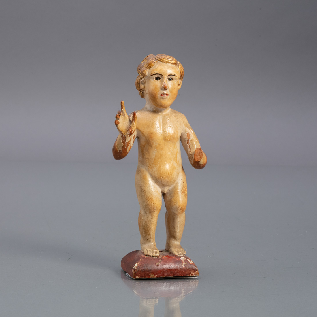 Escultura em buxo policromada e dourada, olhos de vidro. Séc. XVIII. Falta de dedos, de uma mão e na pintura.