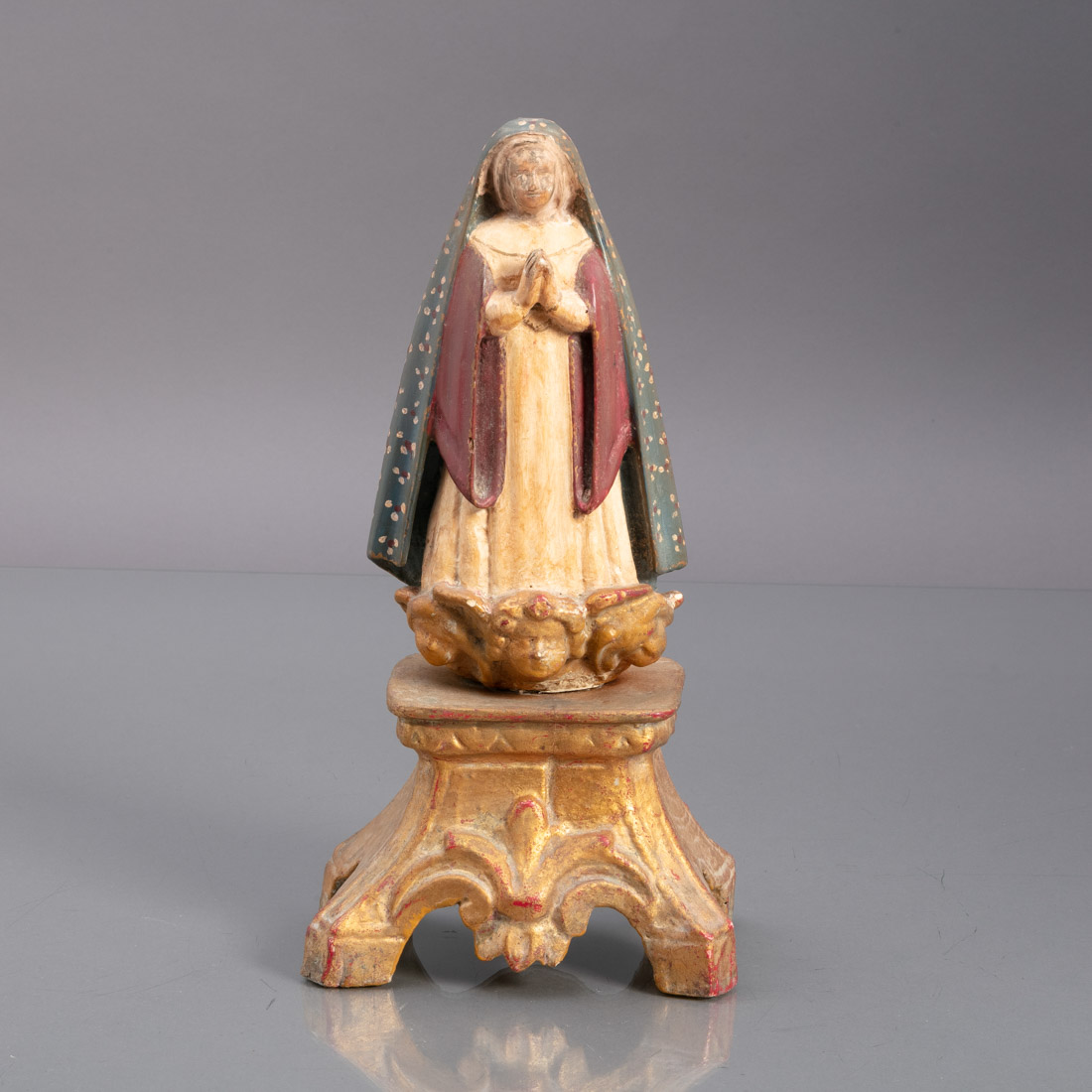 Escultura em madeira policromada e dourada. Pequenas falhas e defeitos.