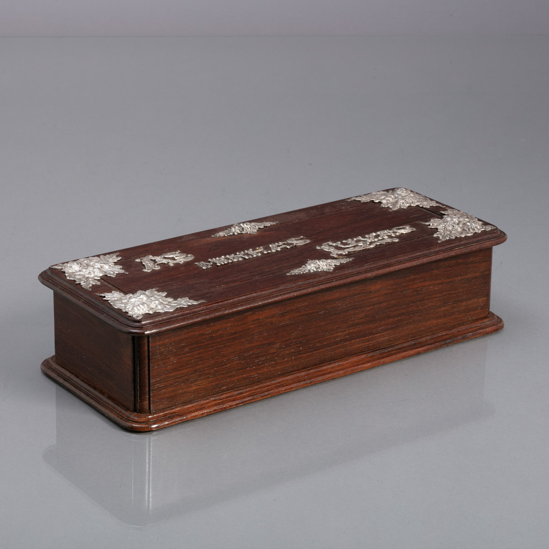Em pau santo, aplicações em prata portuguesa contraste javali (1887-1937) de 833, decoração relevada "flores". Sinais de uso.
