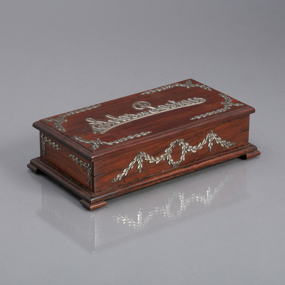 Em pau santo, aplicações em prata portuguesa contraste javali (1887-1937) de 833, decoração relevada "folhagem". Pequenos defeitos.