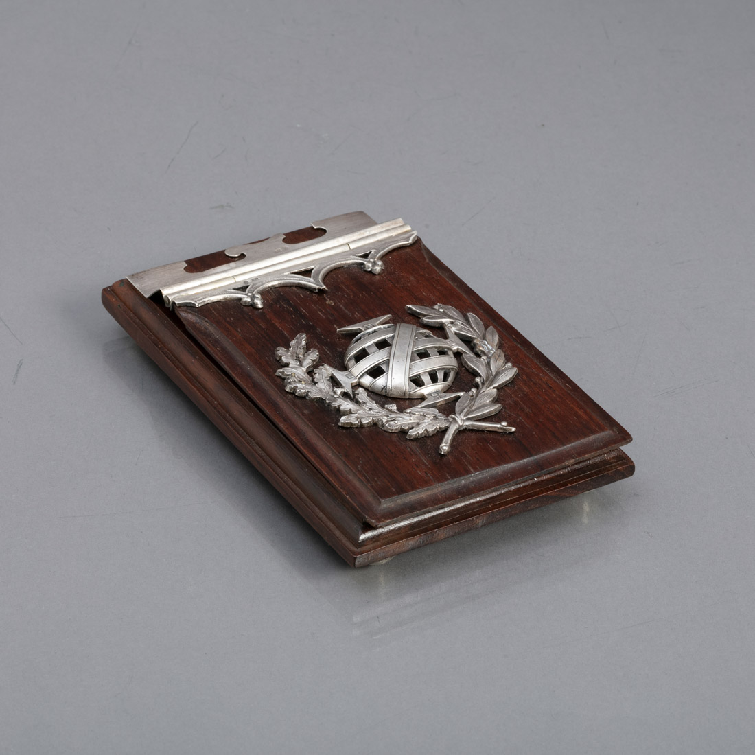 Em pau santo, aplicações em prata portuguesa contraste javali (1887-1937) de 833, decoração relevada "esfera armilar".