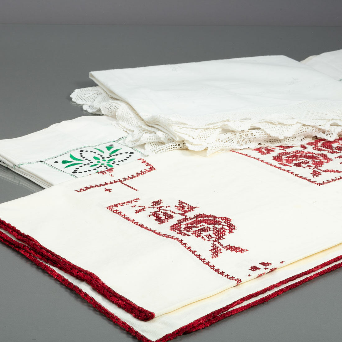 Em algodão, duas com bordado colorido e uma com bordado branco e aplicação de renda em croché de algodão.