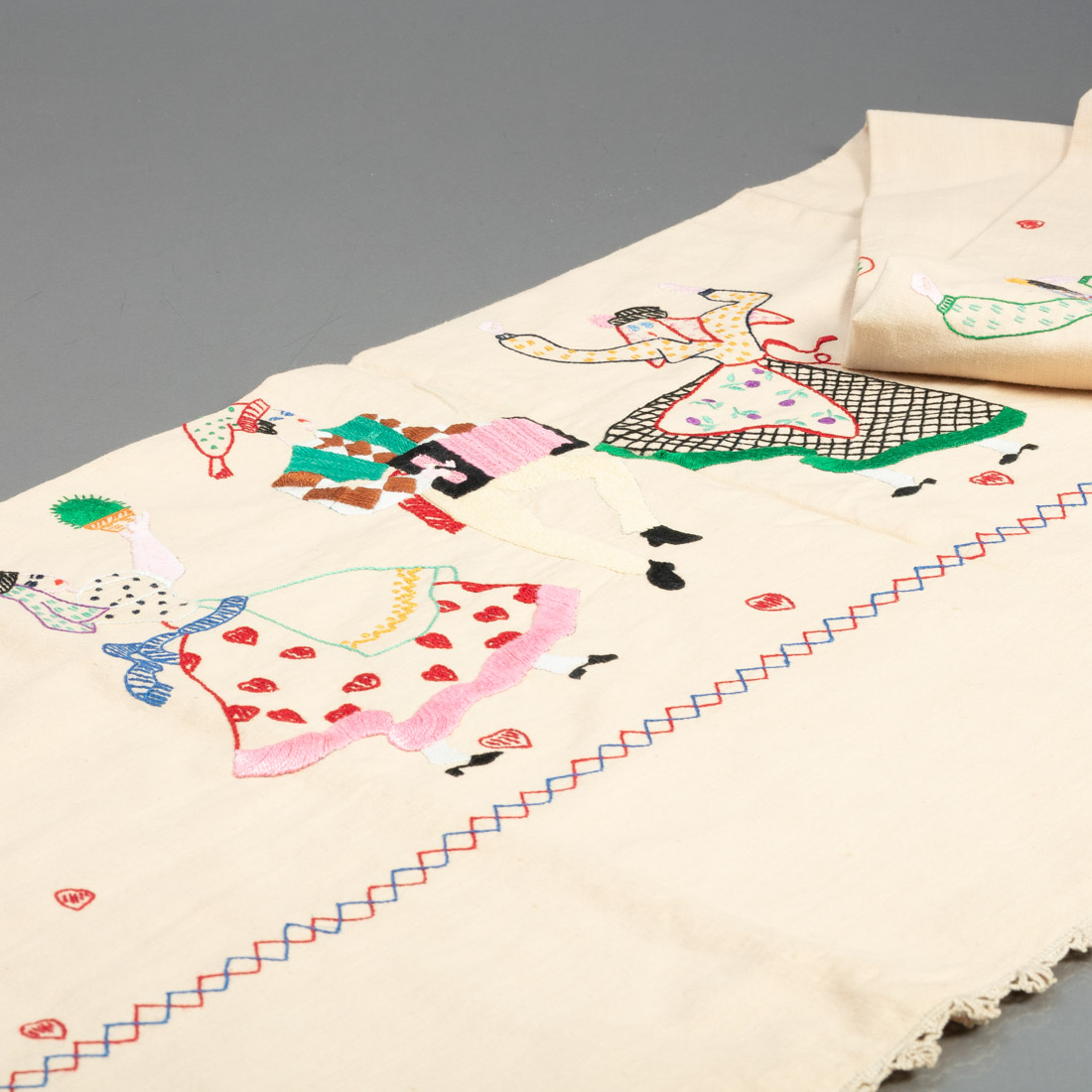 Em algodão de tom bege com bordado colorido "danças portuguesas", aplicação de renda em croché de algodão. Manchas.