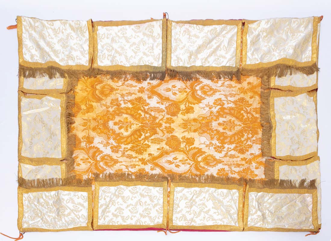 Em seda adasmascada com galões e franjas douradas. Manchas, falhas e defeitos.