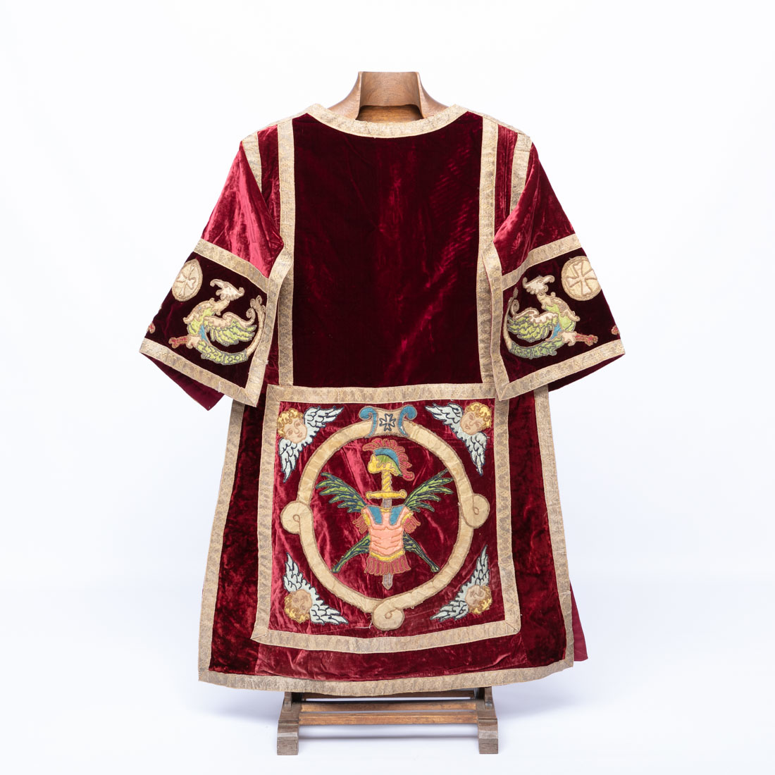 Em veludo com galões dourados e aplicações bordadas. Pequenos defeitos e restauros.