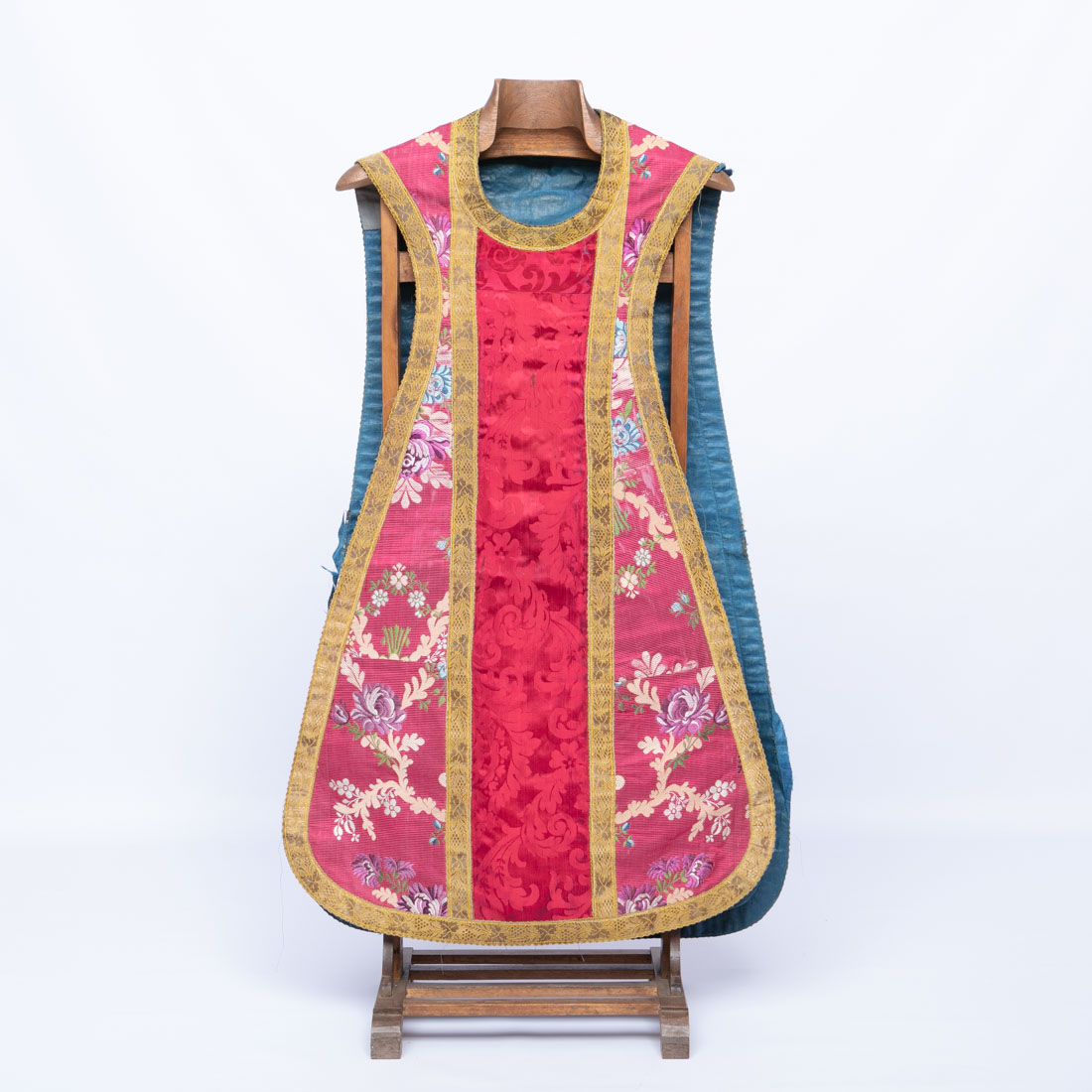 Em seda adamascada com galões dourados. Pequenas manchas e defeitos.